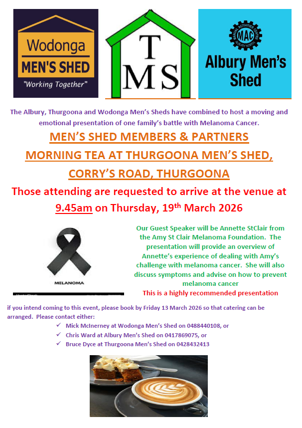 There will be a multi-shed presentation on Melanoma Cancer at the Thurgoona Men's Shed, Corrys Road on !9 March, starting at 9:45 am.