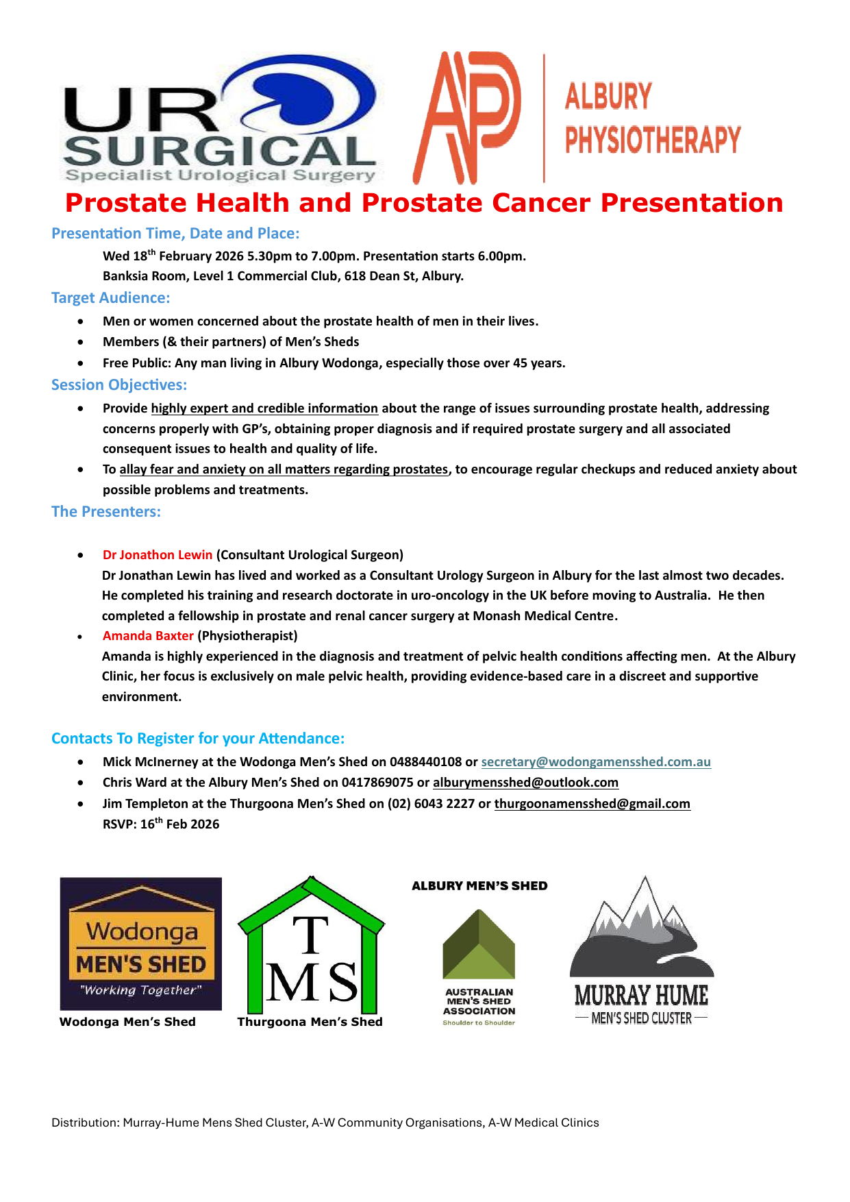 The Albury Men's Shed, together with Thurgoona and Wodonga Sheds of the Murray-Hume Cluster, are supporting a prostate health promotion being held at the Commercial Club.